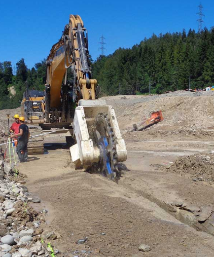 Решение: Была подобрана дисковая фреза для экскаватора KEMROC DMW 130 (производства Германии). Данная модель оснащена двумя высокомоментными гидромоторами и предназначена специально для нарезки узких траншей (шириной 130 мм) на глубину до 600 мм в скальных породах и мерзлоте.