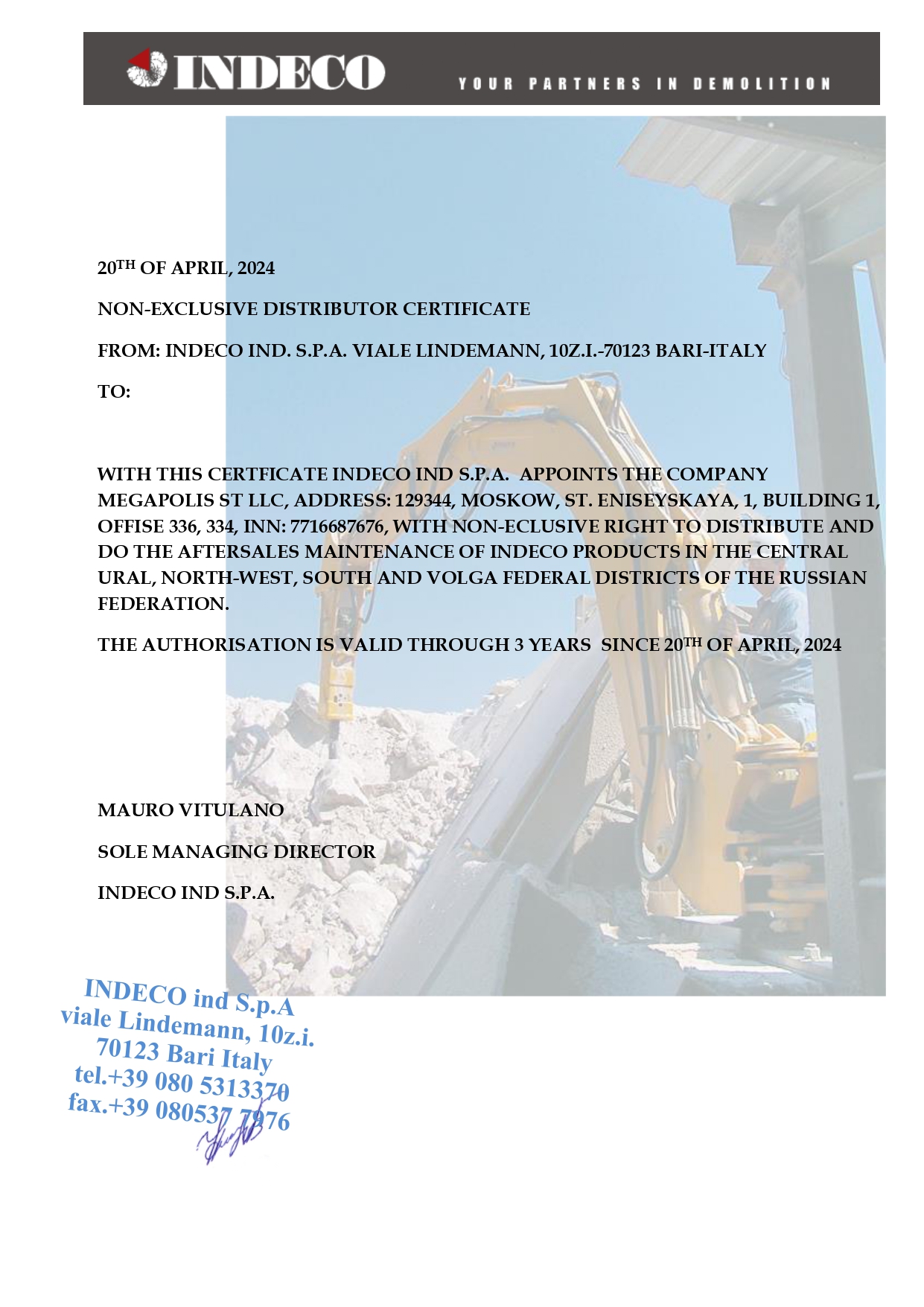 ООО «Мегаполис-СТ» — авторизованный прямой импортер итальянского навесного оборудования Indeco. Мы поставляем профессиональные гидравлические ножницы напрямую с завода, обеспечивая клиентам лучшие цены, заводскую гарантию и оперативный доступ к складу оригинальных запчастей (челюстей, ножей и ремкомплектов) в Москве.