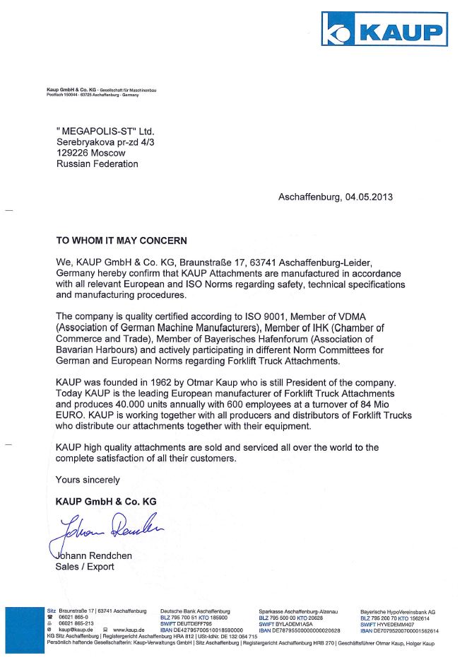 Компания KAUP GmbH&Co.KG основана в 1894 г. С 1962 года специализируется в области навесного оборудования для вилочных погрузчиков.